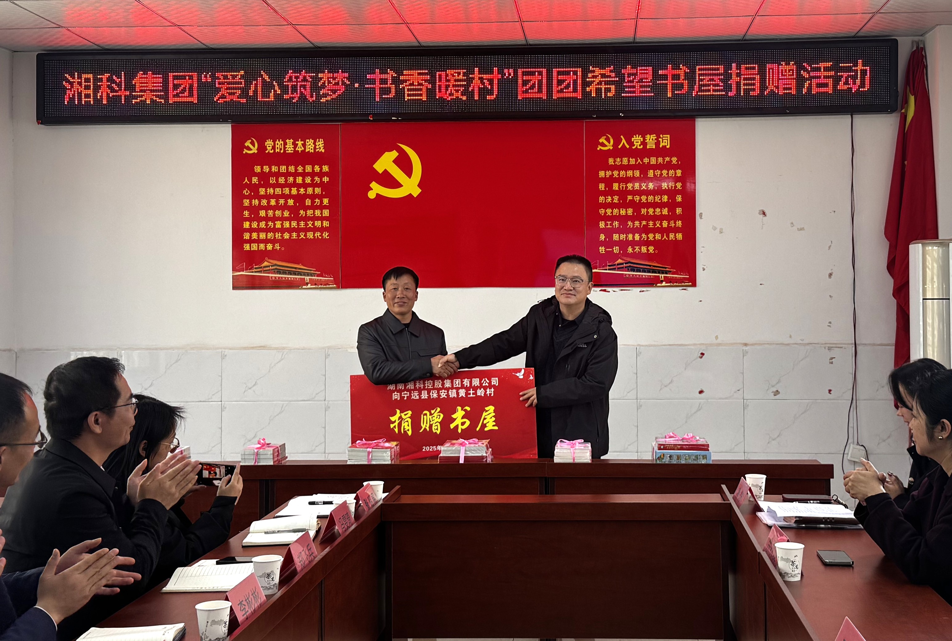 11月25日,由共青團(tuán)湖南省委指導(dǎo)、湖南省青少年發(fā)展基金會支持的“愛心筑夢·書香暖村”團(tuán)團(tuán)希望書屋捐贈儀式在寧遠(yuǎn)縣黃土嶺村舉行。湘科集團(tuán)作為本次活動的發(fā)起單位,通過整合資源、創(chuàng)新形式,為鄉(xiāng)村振興注入文化動能,標(biāo)志著集團(tuán)在教育公益領(lǐng)域邁出堅(jiān)實(shí)步伐。集團(tuán)黨委書記、董事長聶誠出席并向黃土嶺村村委會捐贈書屋。