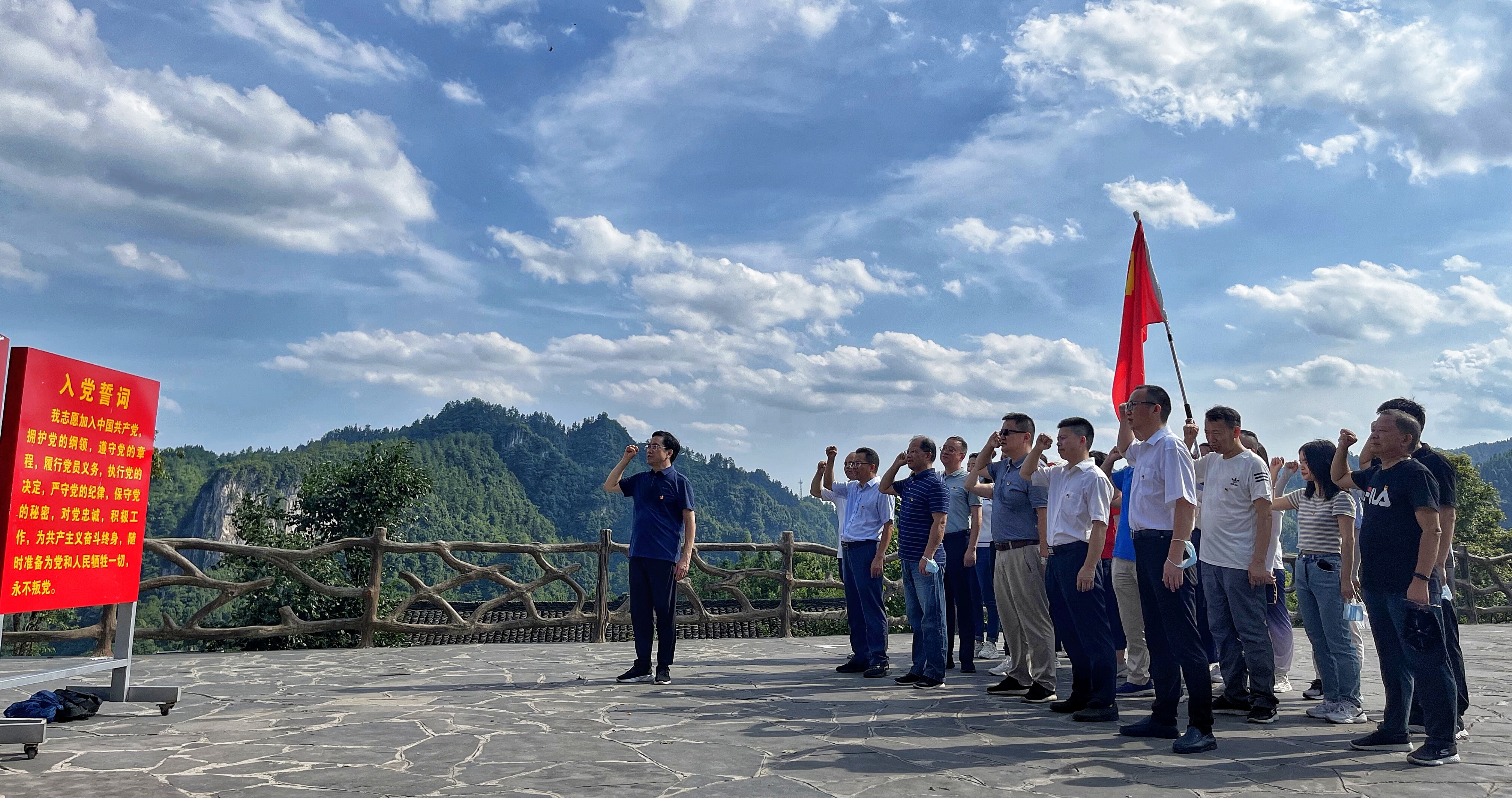 “我志愿加入中國(guó)共產(chǎn)黨,擁護(hù)黨的綱領(lǐng),遵守黨的章程,履行黨員義務(wù)……”全體黨員隨后來(lái)到精準(zhǔn)扶貧廣場(chǎng),面對(duì)黨旗,高舉右拳,重溫入黨誓詞,進(jìn)一步堅(jiān)定理想信念,提升思想覺(jué)悟。